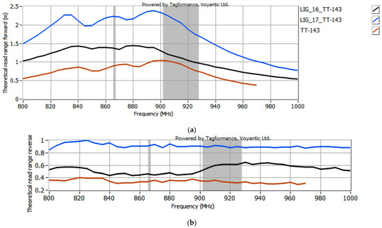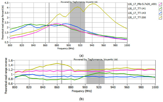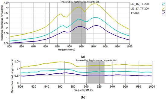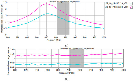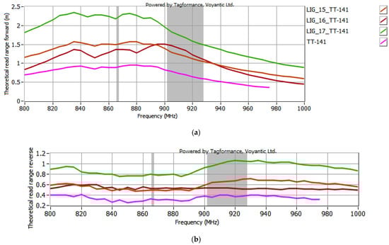Figure 9. Read range of RFIDLIG transponders with TT-200: (a) forward (rPwrMax); (b) reverse (rBtrMax) link. - 5.7x20_v001 module coupled with samples #16 and #17 (Figure 10).