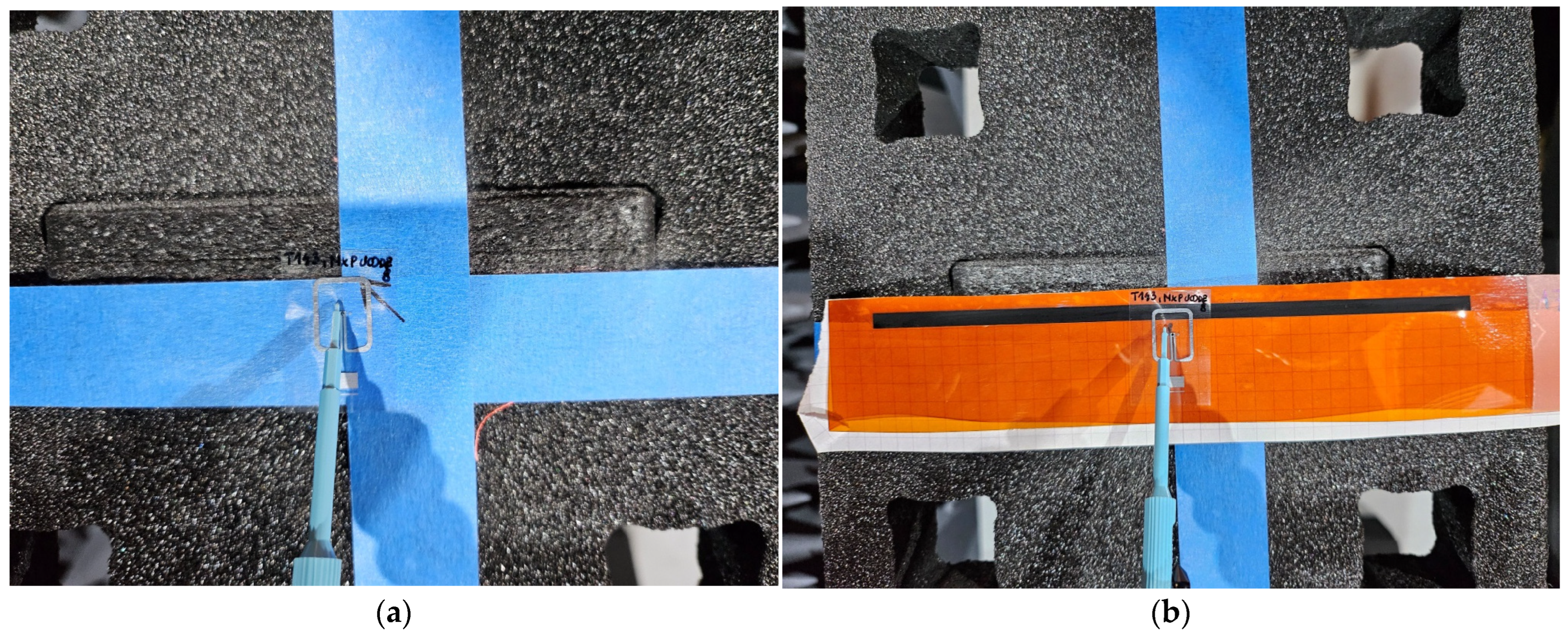 In the first step of the experimental research, the read range of the microelectronic modules, not yet coupled with the antenna modules, was measured (Figure 4a). Next, this parameter was determined for the complete RFIDLIG tags (Figure 4b), consisting of an antenna module inductively coupled with the graphene path at the center of the LIG sample. The obtained results were used to assess the impact of the attached graphene antenna on the transponder’s operational efficiency within the RFID system. The measurement results are summarized in Section 3.2.