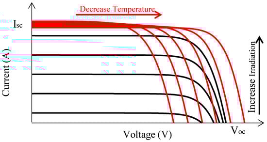 Equation (2) represents the relationship between the current () and voltage () of the PV panel. The data of the MSX-60 [17] are used to investigate the I-V characteristics under different radiation and temperature conditions. The survey results in Figure 2 show that when the temperature changes, the fluctuates insignificantly; on the contrary, it is greatly affected by the radiation changes. Furthermore, it depends linearly on both these parameters. For the , this relationship is nonlinear. Therefore, it is necessary to calculate the value under changing radiation conditions, especially under PSCs.