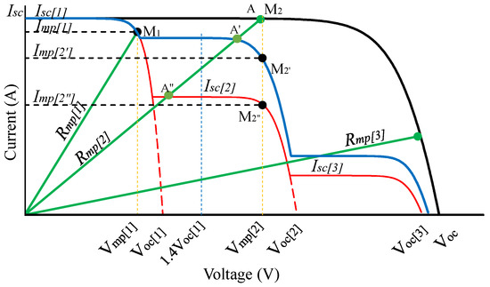 Assuming the PV system operates under uniform conditions, the value , so at the MPP of the second step region (), the resistance value () is estimated according to (14). In this case, the line representing intersects the I-V curve at point A, which coincides with . However, suppose the PV system operates under inhomogeneous conditions. In that case, the MPP of the second step region will shift to or , depending on the shading level. So, the intersection point between the line representing and the I-V curve will be or , which does not coincide with or (Figure 4).