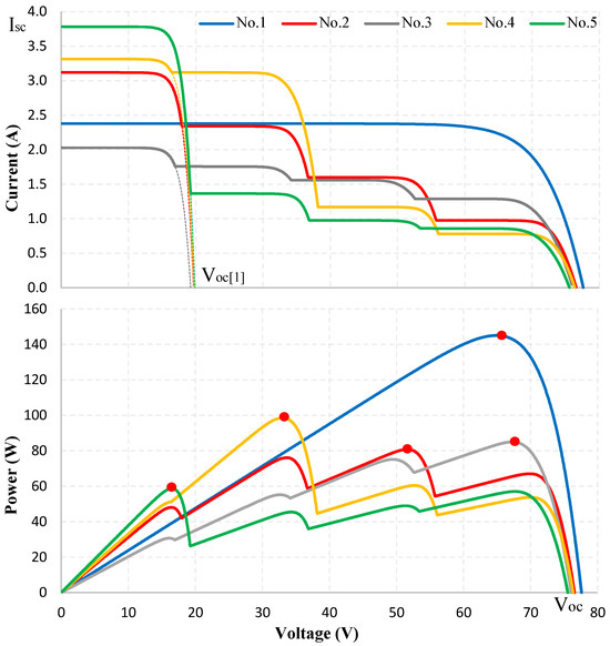 When operating under uniform conditions (No.1), the output power is approximately 99.75% the maximum power of the PV system (Figure 11). The results indicate that the short circuit current value of the PV system, determined from the initial position D = 0.8, is also the short circuit current in the first step region (). Then, the LMPP values in the regions are determined and updated sequentially. The current waveform shows that the values in different regions do not differ significantly. However, the current in zone 4 is slightly lower than in the other regions because the measurement point falls within the transition region between the linear and nonlinear segments of the I-V curve.