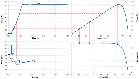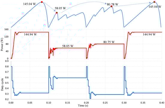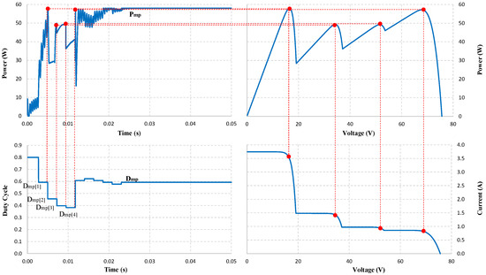 Under partial shade conditions, in Figure 8, the P-V waveform shows that the GMPP value at is approximately . Algorithms with poor accuracy are often trapped in LMPP in similar cases. However, with the ability to accurately estimate and adjust appropriate parameters, the proposed solution has excelled in determining the correct GMPP. This advantage can be explained by the duty cycle waveform, with the initial value D = 0.8 used to determine the of the PV system. Then, the and values are calculated in 11.7 ms. The solution selects the value = 0.6057 as a reference point to check the optimal working position from this data. Through 6 adjustment steps, the P&O algorithm converges at = 0.5925 after that. The total time for the proposed solution to converge at GMPP is 25.71 ms. The output power stabilized at the optimal position immediately after that, with about 58.05 W reaching 100%.