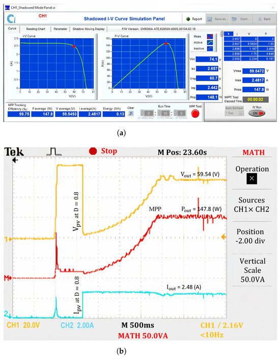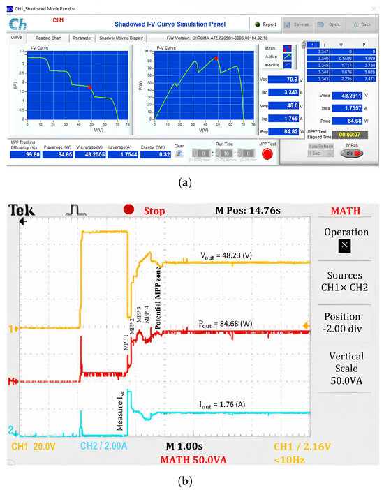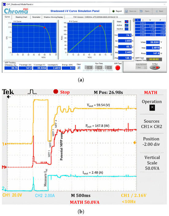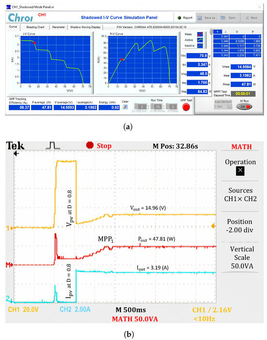 Experimental results with the proposed algorithm under PSCs. (a) MPP value, and (b) output waveforms.