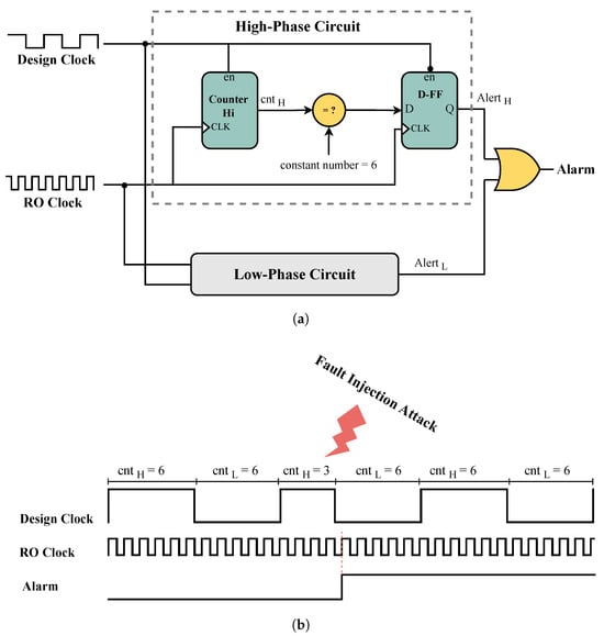 Schematic diagram and waveforms of the counter-based detector proposed in []. (a) Schematic of the counter-based detector. (b) The figure illustrates how FIA (marked by the red line) reduces the design clock period, decreasing the number of RO clock rising edges from 6 to 3 and activating the alarm.