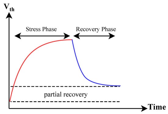- Recovery Phase: When stress is removed, the transistor might partially recover its original performance, but it may not fully return to its initial state, as shown in Figure 3. The recovery phase follows the stress phase in BTI.