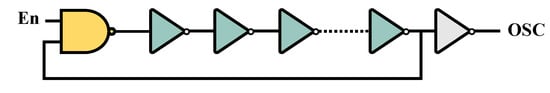 The implemented ROs can be used in a detector’s design. For instance, as shown in Figure 2 from [], this detector consists of two high- and low-phase circuits, which are used for the one- and zero levels of the clock signal, respectively.