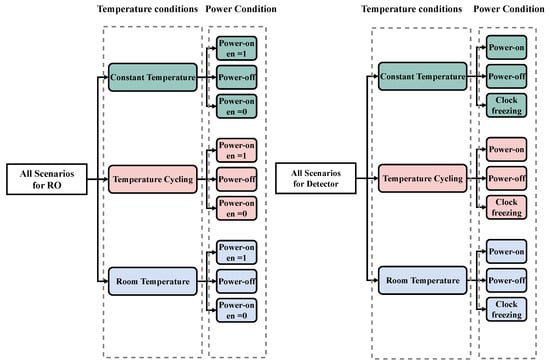 Figure 11 displays how heating over 21 days affects the RO. Notably, the figure reveals that the impact of POTAs on ROs is small but observable, similar to the detector. An important observation here is that clock freezing has a more significant impact on both the RO and detector compared to other scenarios. This is because when transistors remain in the same state for extended periods without switching between on and off states, they become more susceptible to aging, which can accelerate aging effects such as BTI. Consequently, we anticipate that clock freezing would have a greater effect on aging than scenarios involving power-on conditions (en = 1 in RO). In simpler terms, the freezing of the clock can intensify the aging process, leading to increased degradation compared to other power scenarios. Temperature cycling also leads to greater degradation in this context, mirroring the effects observed in the detector. This similarity in degradation could be attributed to the same underlying reasons observed in the case of the detector. As shown in [], at a temperature of 90 °C (under DC stress and a 1.3 Vnom supply voltage), the RO frequency variation is around −3% after one year. Remarkably, after just one month, this variation is approximately −1.5%, which closely corresponds with our findings, despite the authors employing a higher power supply.
