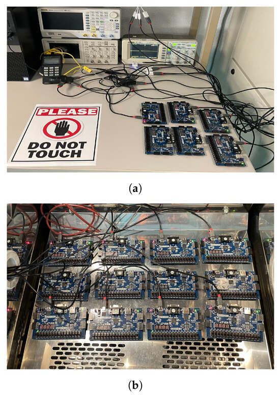 As mentioned in the previous sections, our objective is to evaluate the impact of overheating on the performance of the delay-based detector and the frequency of the RO in various power and temperature conditions. For each DUT (RO and delay-based detector), we examined nine scenarios: three temperature conditions and three power conditions. We implemented each scenario on a separate BASYS-3 board (manufactured by Digilent, Pullman, WA, USA) with an Xilinx Artix-7 FPGA (manufactured by AMD, Santa Clara, CA, USA), for a total of 18 boards.