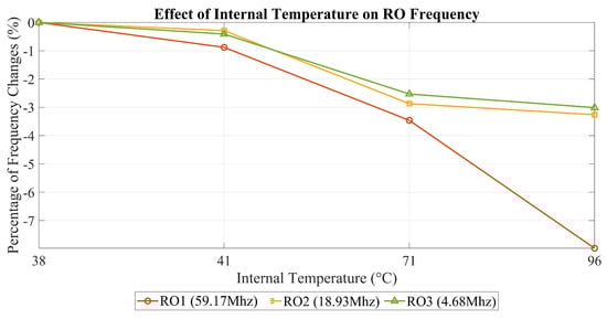 Additionally, Figure 9 illustrates the differential impact of heating on ROs operating at different frequencies. Three ROs are represented: the red RO at 59.17 MHz, the yellow RO at 18.93 MHz, and the green RO at 4.68 MHz.
