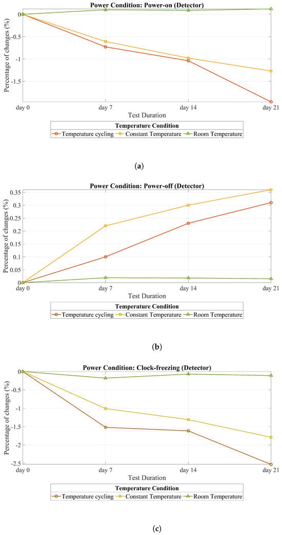 As we explained earlier, we considered three different temperature conditions and three power conditions for the detector. Figure 10 shows all these scenarios for our detector. In Figure 10a, we can see the scenario where the detector is powered on under the three temperature conditions. Similarly, Figure 10b,c demonstrate the scenarios in which the detector is powered off and the clock is freezing, respectively.