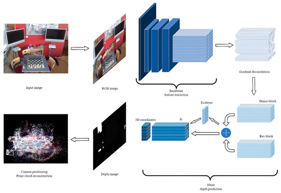 Feature extraction is a key step in the fields of computer vision and image processing, serving to extract useful feature information from raw data to support subsequent tasks such as classification, detection, and recognition. Initially, feature extraction relied on manually designed methods such as edge detection and corner detection, which possess invariance and distinctiveness, requiring extensive expert knowledge and a targeted design [7]. Subsequently, with the development of deep learning, data-driven feature learning has become mainstream. Early classic models such as LeNet [8], AlexNet [9], and VGG [10] that utilize convolutional neural networks learn feature representations from raw data, overcoming the limitations of manual feature extraction and making feature detection learning and usage more efficient and automated. In recent years, with the increase in computing resources and the prevalence of large-scale datasets, transfer learning using pre-trained models has become increasingly popular. For instance, models such as ResNet [11] and EfficientNet [12] include a wealth of pre-trained weights available online, and utilizing these pre-trained weights can significantly enhance the performance for specific tasks while reducing data requirements and computational costs. The backbone used in our model, derived from the ACE model, consisted of eleven convolutional layers and two skip connections. The convolutional layer weights were obtained from a week-long pretraining on the first 100 scenes of the ScanNet dataset [13], enabling the rapid and effective extraction of crucial feature information from images. Moreover, for scene localization, the information from the image feature extraction part is transferable across scenes, and not affected by scene variations in terms of the localization accuracy. Therefore, this structure can effectively reduce the training time required for new scenes, better meeting the practical demands of application scenarios.