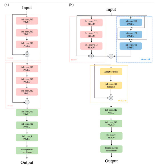 Here, and are used to clip the value of the scaling factor determined by , and ensures that, when is 0, the output homogeneous parameter is 1. The normalized homogeneous parameter w, computed as described, enables the dehomogenization of the network’s output coordinates according to the formula , resulting in the predicted actual coordinates of the 3D scene. Figure 2 illustrates the head network structure of the meta-model and the improved results of the head network described in this section. It is evident that our designed network, while maintaining a similar parameter count, enhances the connectivity between its upper and lower layers, thereby more effectively extracting and transmitting image features.
