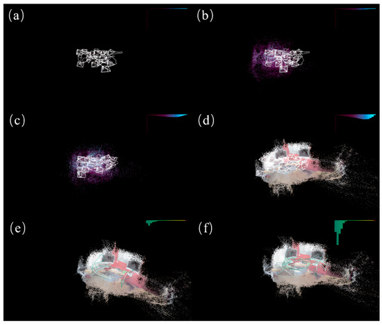 The scene reconstruction process and results for the chess scene of the 7scenes dataset using the improved model. (a) shows the scene reconstruction during the initial phase of model training, (b,c) depict the scene reconstruction during the model-training process, (d) illustrates the scene reconstruction after the completion of model training, and (e,f) display the camera localization and scene reconstruction during model testing, with the bar graph in the top-right corner representing the percentage of pixel offsets within various segmented thresholds.
