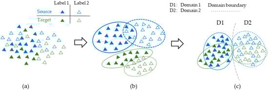 The training process of the method is shown in Figure 2. The first step aims to establish a nonlinear map from the source domain data sample, , to the source labelling space; then, the model can obtain knowledge of the source domain, as shown in Figure 2b. The second task aims to build a cross-domain model that can eliminate domain distribution differences and extract domain-invariant features, as is shown in Figure 2c. Finally, the model achieves the ability to classify the unlabeled fault data from the target domain.