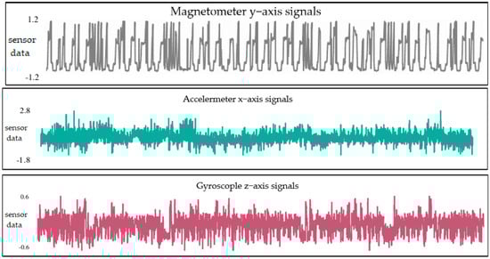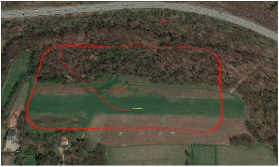 It is difficult to obtain enough data to train a reliable fault-diagnosis model, since UAV sensor data from real scenarios are characterized by small samples with incomplete labels. Therefore, for this study, we selected the AirLab Failure and Anomaly (ALFA) dataset, an open database from Carnegie Mellon University [], as the source domain dataset. This dataset records flight data from a small flight test platform, as shown in Figure 3. The flight test platform is equipped with a fixed-wing drone, a model called CarbonZ T-28. It has a 2 m wingspan, a central electric engine, a GPS module, a Pitot Tube airspeed sensor, and an Nvidia Jetson TX2; it uses Pixhawk as the flight-control system. The robot operating system collects signal data from the flight-control system and sends them to the ground station at regular intervals. The flight path taken during the test is shown in Figure 4. The dataset includes processed data for 47 autonomous flights with 23 sudden full-engine failure scenarios and 24 scenarios for other types of sudden control faults, with a total of 66 min of flight in normal conditions and 13 min of post-fault flight time. Additionally, it includes many hours of raw data of fully autonomous, autopilot-assisted, and manual flights, with tens of fault scenarios. The ground truth of the time and type of faults is provided in each scenario to enable the evaluation of new methods using the dataset. The ALFA dataset contains a variety of sensor raw data and fault data, in addition to the labels of fault diagnosis related to the sensors of this drone. Figure 5 illustrates the data waveforms of three sensor signals under normal conditions in the ALFA dataset.