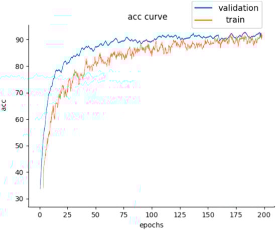 As can be seen from Table 3, the method is able to maintain a cross-domain fault identification accuracy of more than 85% between different datasets; occasionally, it can exceed 90%. The network has a robust cross-domain identification of these four fault label types. Taking the A→B test as an example, the model accuracy and the loss value changes are shown in Figure 7 and Figure 8. As can be seen from Figure 7, in the training stage of the model, the label classifier’s training accuracy rises gradually with each iteration. The accuracy is close to 90% at about 120 iterations and tends to stabilize. The fluctuation amplitude of accuracy is obvious during the iteration process. Meanwhile, in the validation stage, the label classifier’s training accuracy is close to 90% at about 70 iterations and tends to stabilize. The fluctuation amplitude of accuracy is fine during the iteration process. This indicates that the model has the ability to predict the faulty labels on the extracted features after learning four types of signal samples gradually. As can be seen from Figure 8, the total loss value of the model decreases gradually with the increase in iterations. The parameters are continuously updated to decrease the difference between the source domain and target domain, eventually close to 0. This indicates that the discrepancy between the two trained domain datasets has been minimized, with the common features being mapped to the shared feature space, namely domain-invariant features.