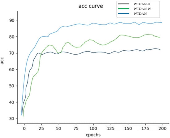 In order to assess the effectiveness of the models in the proposed method, we conducted ablation experiments for comparison. WTDAN−D denotes the method which removes the domain discriminator in WTDAN; WTDAN−W denotes the method which removes the weight factor in WTDAN. We test the two ablation methods with the same conditions as the A→B test in Test 1. The final accuracy results, as measured by WTDAN−D and WTDAN−W, are 70.58% and 84.41%, respectively. In order to highlight the main features of these accuracy curves, we conducted some smoothing of the experimental data curves. It can be seen from Figure 9 that the WTDAN−D fault recognition rate is at a low level; the model is unable to enrich small sample datasets or bridge the category imbalance differences. According to the WTDAN-W results, the training speed is slow and is not stable in the late stages of the training process; the model’s performance is turbulent due to the difficulty that arises in identifying negative samples and the underutilization of positive samples in the dataset.