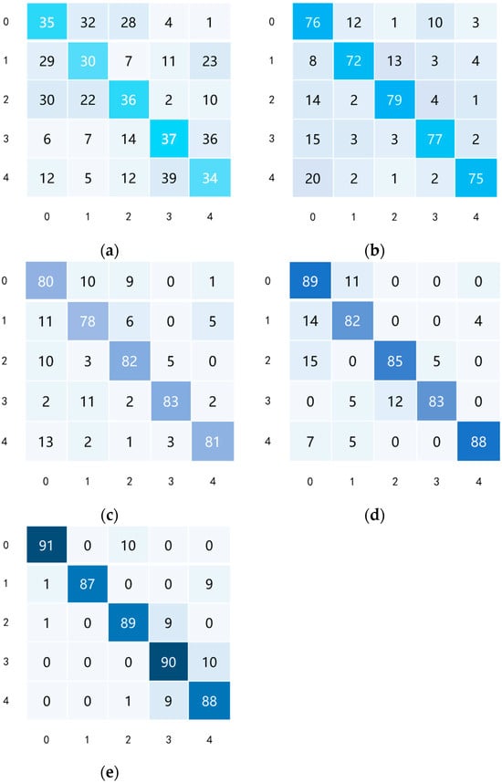 To further show the performances of the different methods in fault diagnosis, the confusion matrices of the above tests were visualized []. There are 100 samples from each type of sensor, and a total of four fault label categories: No.0-4 correspond to the normal status and the four fault labels, as shown in Figure 10a–e. The horizontal coordinate is the predicted label, and the vertical coordinate is the true label. It can be seen from these confusion matrices that the enumerated methods have different performances in identifying the different sensor fault categories. Overall, the proposed method performs best for fault identification.