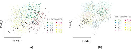 T-distributed stochastic neighbor embedding (t-SNE) can be used to visualize high-dimensional data by mapping samples in the original feature space to a two-dimensional space, clustering the same categories and separating different properties. In order to visually show the classification performances of these models, the test results for the five sets are visualized with t-SNE dimensional reduction [], as shown in Figure 11a–e. The normal, constant, drift, instant, and bias fault labels are set to S_0, S_1, S_2, S_3, and S_4, respectively; labels from the target domain are set to T_0, T_1, T_2, T_3, and T_4, accordingly.