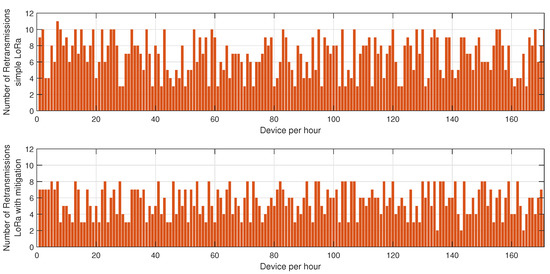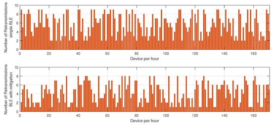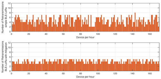 Impact of the proposed mitigation algorithm on LoRa and BLE retransmissions under jamming conditions.