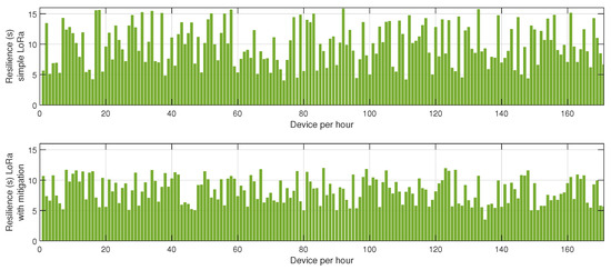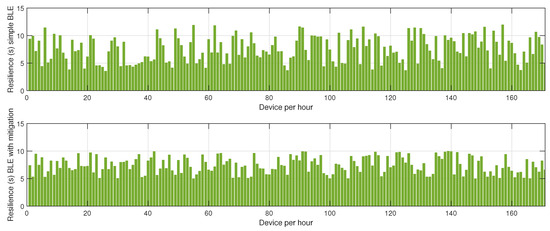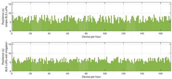 The results presented in Figure 8, Figure 9 and Figure 10 offer a detailed assessment of the energy efficiency, retransmission rates, and resilience of the hybrid BLE-LoRa network under jamming conditions, considering the implementation of the proposed cluster-based mitigation algorithm. Figure 8 illustrates the energy consumption trends when the network operates under dynamic switching between BLE and LoRa. In the absence of the mitigation strategy, energy consumption remains inconsistent and significantly higher due to frequent protocol switching, which occurs inefficiently in response to interference. This behavior suggests that without an intelligent decision-making mechanism, the network expends unnecessary energy while attempting to maintain connectivity. However, when the proposed mitigation algorithm is integrated, energy consumption is optimized as the system adaptively selects the most efficient communication protocol based on real-time network conditions. The algorithm ensures that BLE is prioritized in low-interference environments to capitalize on its low power consumption, while LoRa is utilized strategically for longer-range communication when BLE is severely affected by jamming. This intelligent switching mechanism reduces unnecessary protocol transitions, resulting in overall energy savings. Figure 9 provides insights into retransmission rates, which, in the unmitigated scenario, remain high due to the instability introduced by uncontrolled switching between BLE and LoRa. The lack of a structured transition mechanism causes frequent packet losses, forcing repeated transmission attempts that lead to excessive network congestion. With the implementation of the mitigation algorithm, retransmission rates drop significantly as the system effectively balances communication load across BLE and LoRa, ensuring that packets are routed through the most reliable and least congested paths. The mitigation strategy employs real-time channel assessment and adaptive transmission power adjustments, reducing the need for redundant transmissions and improving network efficiency. Figure 10 evaluates the resilience of the hybrid network, measuring the recovery time required to restore stable communication after a jamming attack. Without mitigation, the recovery time is prolonged due to the network’s reactive rather than proactive approach in dealing with interference, leading to delays in selecting the optimal communication mode. In contrast, the implementation of the mitigation algorithm allows the network to swiftly adjust to changing interference conditions by dynamically reconfiguring its topology and making predictive decisions on protocol switching. This proactive adaptation significantly reduces recovery time, ensuring minimal disruption and improved continuity of communication. Collectively, these findings highlight the effectiveness of the proposed mitigation algorithm in optimizing the hybrid BLE-LoRa network’s performance under jamming conditions. The results validate that by integrating intelligent switching, adaptive routing, and cluster-based coordination, the network not only achieves lower energy consumption and reduced retransmissions but also exhibits enhanced resilience against interference. This underscores the necessity of advanced network management strategies to fully harness the benefits of hybrid communication systems in real-world IoT applications where reliability and energy efficiency are critical.
