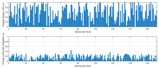 Figure 12 was constructed based on experimental data collected from real-world jamming scenarios in a heterogeneous LoRa-BLE wireless sensor network. The dataset consists of the energy network performance metric recorded over multiple controlled experiments conducted within a university campus environment. The data were sampled at regular intervals, ensuring uniform time distribution across different interference conditions. Each recorded data point corresponds to a measurement taken from sensor nodes deployed in varying locations, including laboratories, classrooms, and open areas, where interference sources such as Wi-Fi networks and mobile devices were present. To generate the histograms, we used a binning strategy that appropriately reflects the data distribution without introducing bias or excessive granularity. The number of bins was determined using the Freedman–Diaconis rule, which balances the need for detailed resolution with statistical significance. The sampling methodology ensured data representativeness by incorporating different interference intensities and network conditions. We performed preprocessing steps such as outlier detection and removal using interquartile range (IQR) filtering to eliminate potential anomalies that could distort the statistical representation. Moreover, normality tests (Shapiro–Wilk and Anderson–Darling) were conducted to determine whether the datasets followed Gaussian distributions, guiding the selection of appropriate statistical analyses. By applying these methods, the histograms and PDFs accurately illustrate the statistical behavior of the network under jamming conditions before and after the mitigation strategy. The results offer valuable insights into how energy consumption was affected by interference and how the proposed mitigation mechanism effectively altered the network’s statistical characteristics.