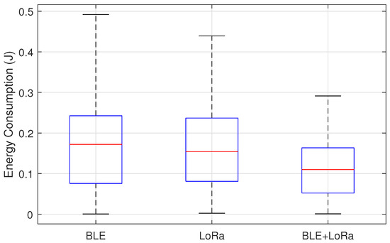 From the boxplots, we can assess which network configuration exhibits higher energy efficiency by comparing the median values. If one configuration consistently has a lower median energy consumption, it implies a more energy-efficient operation. Additionally, the spread of the box and whiskers indicates the consistency of the energy consumption. A wider IQR or longer whiskers suggests higher variability, which may indicate unpredictable energy consumption patterns, potentially affecting network stability. If a configuration has numerous outliers, it signals instances where energy consumption deviates significantly from the expected range, which could be problematic in resource-constrained environments. Comparing BLE, LoRa, and BLE+LoRa, we can critically evaluate trade-offs between energy efficiency and network performance. BLE, typically designed for short-range and low-energy applications, is expected to have lower energy consumption but may suffer from limited coverage. On the other hand, LoRa, optimized for long-range communication, likely shows higher energy consumption but ensures greater reach and coverage. The BLE+LoRa hybrid approach aims to balance these trade-offs, adapting between protocols based on network conditions. If the boxplot reveals that BLE+LoRa has a median closer to BLE but a higher spread, it suggests that the hybrid approach achieves some energy savings but introduces variability due to switching.