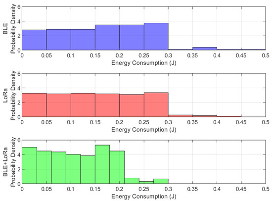 From this analysis, we can determine whether the energy consumption follows a normal distribution, is skewed towards lower or higher values, or exhibits multiple peaks. A narrow and tall peak suggests that most energy values cluster around a specific range, indicating a consistent and predictable energy consumption pattern. In contrast, a wider or multi-modal distribution suggests fluctuations and inconsistencies in energy usage. If BLE exhibits a tight peak at lower values, it confirms that it is the most energy-efficient. If LoRa shows a wider and flatter distribution, it suggests more variability in energy demand, which could stem from varying transmission distances. The BLE+LoRa configuration, ideally, should demonstrate a balanced peak that does not lean too much towards either extreme, indicating an adaptive trade-off between efficiency and performance.