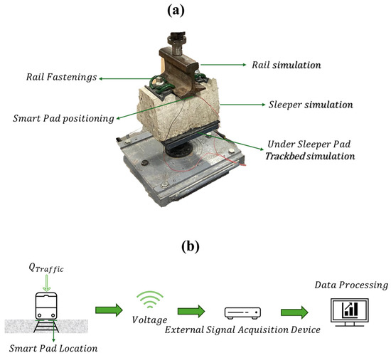 To validate the performance of Smart Pads, laboratory simulations were conducted to replicate real-world railway conditions. A 250 mm UIC 54 rail section and a 357 mm prestressed concrete sleeper section were used to model a typical ballasted track structure (Figure 2a). Additionally, a 10 mm rubber mat was placed beneath the sleeper to simulate track bed elasticity. These simulations confirmed that Smart Pads accurately capture wheel–rail interaction forces, providing reliable data for track maintenance planning.
