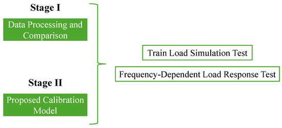 This setup was designed to demonstrate the capability of the system to detect changes in contact between the train and the track. Additionally, it is important to note that the applied load represented 25% of the load exerted by a train axle (as shown in Figure 6, in the train load diagram). This percentage accounts for the load per wheel (50% of the axle load) and the concentration of stress on a central sleeper, where the load under the wheel was approximately 50% of the total—aligning with findings from [40,42].