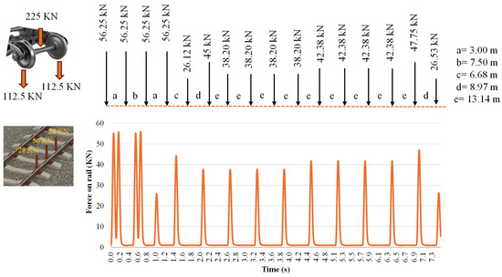 To monitor traffic conditions, forces were applied to the rail to simulate the passage of a typical train traveling along the railway. Figure 6 illustrates the loads applied by each wheel axle and the distances between them, the application distances were determined based on each axle of the train. For example, with loads of 16.98 tons (equivalent to a train axle load), a spacing of 13.14 m is set, representing the distance between axles required to pass through the same point which depends on the train velocity. In this case, it takes a total of approximately 0.5 s (for a 13.14 m distance) for a train axle to pass a given point and for the next axle to follow, that is because the train speed was set at 100 km/h in this study to better understand the influence of variable load application from the laboratory test machine, according to the different train load levels defined in this document. However, various train axle loads and distances are observed, reflecting the different types of passing cars, from the locomotive to standard passenger cars.