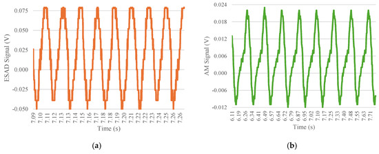 One key advantage of the ESAD is its impact on sensor proximity and signal quality. Its direct connection to the Smart Pad significantly reduces signal degradation and noise pickup. In contrast, the AM relies on a long, unshielded 2 m cable, which increases electrical impedance and susceptibility to electromagnetic interference (EMI). This longer transmission path introduces signal distortions and attenuates higher-frequency components, leading to the observed triangular waveform in the AM output. Since the ESAD is installed closer to the sensor, it minimizes such interference and preserves the integrity of the original piezoelectric response.