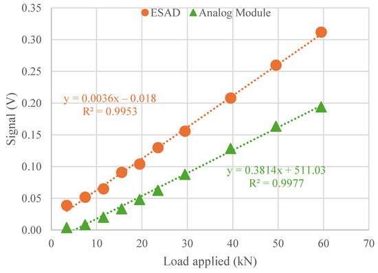 Additionally, Figure 8 demonstrates the signal amplitude plotted at a frequency of 5 Hz across different load levels to assess each system’s capability to monitor variations in wheel–vehicle interaction. The detection of the 10 load steps, ranging from 4 kN to 60 kN, aligns precisely with the 10 detected points. The results demonstrate a linear relationship with reliability exceeding 99% in both cases, indicating that both devices could effectively detect changes in the applied rail load and, consequently, variations in fastening tension. This capability is crucial for the primary function of Smart Pads. Table 3 has been included as a reference to compare the signal values obtained from both devices. As demonstrated throughout the paper, the analysis is conducted using voltage values, which represent the signal provided by the piezoelectric sensor. Similar studies [18] comparing analog and digital modules have also utilized voltage signals from piezoelectric sensors for their comparisons. For example, under a 12 kN load, the ESAD records a voltage of 0.065 volts with a sensitivity of 2.30 kN. This indicates that the ESAD accurately measures the 12,000 newtons applied, allowing for the calculation of the load exerted on the track. For the exact same load, the AM measures 0.020 volts, slightly minor amplitude which could be due to the disturbances that occurred in the Sensor-AM connection being by a 2 m cable device compared to the direct Sensor-ESAD connection.