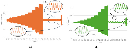 Figure 9 also zooms in on the 1 Hz and 10 Hz steps to illustrate how both devices handle variations in frequency. At 1 Hz, the signal alignment is poor in both cases, as low-frequency components introduce phase lags and inconsistencies in the piezoelectric sensor’s response. Even so, the AM signal appears much clearer than ESAD. However, the importance of accurately defining the signal amplitude remains the same. This clarity makes the sine waves easier to distinguish, but the overall interpretation of the signal remains unchanged. That said, such low frequencies are rarely encountered on railroad tracks, as they are typically exposed to higher frequencies. These low-frequency components only occur at very low train speeds, which are uncommon in typical operating conditions. However, at 10 Hz, the ESAD maintains a smooth and continuous sinusoidal response, whereas the AM still struggles with distortions, highlighting its lower fidelity in capturing dynamic loads.