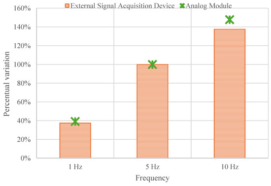 Figure 10 illustrates the calibration comparison signals obtained from both data processing devices at the three analyzed frequencies (1, 5, and 10 Hz). Considering these three frequency steps enables the evaluation of both devices’ performance under various sensor signal behavior [23]. At first glance, the results were comparable, with both systems showing an increase in signal amplitude percentual variation as the frequency increases. When analyzing the percentage variation from 1 Hz to 5 Hz for both devices, the results were nearly identical: increasing 38% for the ESAD and 39% for the AM. However, from 5 Hz (used as a reference) to 10 Hz, the AM exhibits a more ‘linear’ behavior with an increase of 48%, while the ESAD shows a slightly lower increase of 38%. This suggests that a correlation could be established between the two devices when frequencies vary, a common scenario in train load applications, as frequency changes along with train speed.