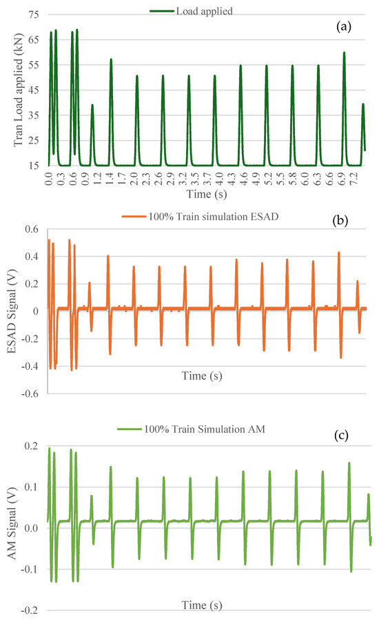 This section analyzes the behavior of the devices under varying train axel loads, applied at different load percentages. The primary objective is to compare the performance of each device and demonstrate that the ESAD reliably detects each train, as illustrated in Figure 11. In this scenario, a train traveling at 100 km/h with a full load is analyzed, focusing on the detection of each passing axle by both measuring devices. In both the ESAD and AM cases, the signal peaks transmitted by the sensor were plotted alongside the applied load. The graphs indicate that at points of higher and lower load, a corresponding reduction in signal is observed. This behavior remains consistent across both devices. For instance, under the first two applied loads (approximately 60 kN), the ESAD recorded signals of 0.5 volts, while the AM recorded signals of 0.15 volts. This difference in voltage values aligns with previous findings (as shown in Table 3), where the ESAD consistently produces higher voltage readings. This discrepancy is attributed to the application of the train wheel load occurring at a frequency of 9 Hz in this instance, where the higher the frequency of the load, the higher the signal value distinguished.