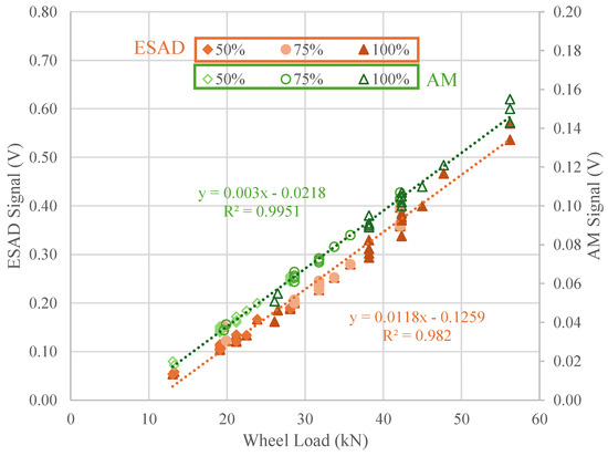 Figure 12 presents a graph comparing the ESAD and the AM, showing the measured signals for three types of trains with loads at 50%, 75%, and 100%. The results indicate very similar measurement signals between the two devices, with reliability rates of 99% for the AM and 98% for the ESAD. The number of points corresponds to the number of axles crossing (16 for each train), each with three different load levels. The “linear trend line” slopes of the two devices were also very similar, though the ESAD exhibits a slightly steeper slope (0.0118x) compared to the AM (0.003x). The slope is a critical parameter, as a steeper slope (as seen in the ESAD) enables more efficient and precise detection of changes in the stresses on the fastenings where the Smart Pads are located.