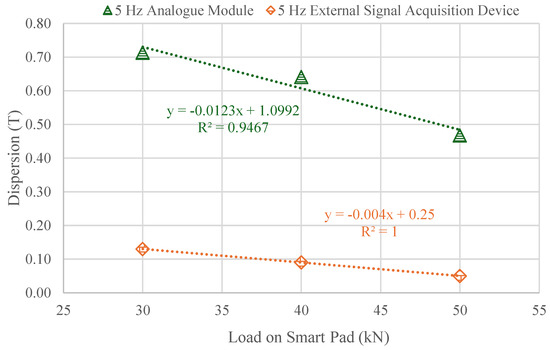 Figure 13 illustrates the evolution of dispersion for the same Smart Pad incorporated sensor in different measuring steps across three load steps (30, 40, and 50 kN) during a frequency cycle at 5 Hz. The analysis reveals an initial decrease in dispersion as the load increases. Notably, the ESAD exhibits lower dispersion compared to the Analog Module, underscoring its superior consistency. This reduction in dispersion, approximately 80% lower than that of the analog module, may also be influenced by the module’s sensitivity. The lower dispersion observed in the External Signal Acquisition Device (ESAD) compared to the Analog Module (AM) could be attributed to its higher sampling rate, improved signal processing, and superior hardware precision. Additionally, the external device may feature better calibration and enhanced shielding against environmental noise, all of which contribute to more stable and consistent measurements.