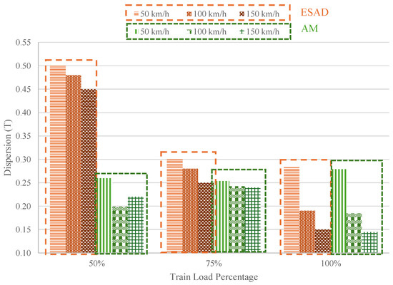 Additionally, Figure 14 presents an analysis of data dispersion for three different train speeds (50, 100, and 150 km/h) at three distinct load levels (50, 75 and 100%). At first glance, the highest dispersions, reaching 60%, occur at the 50% load level. As the load level increases to 100%, the dispersion decreases significantly, with values ranging between 20% and 10%. As seen in Figure 13, increasing the load results in decreased dispersion, suggesting improved measurement accuracy at higher loads. This is advantageous for the application of Smart Pads on the track, where train loads are typically substantial.
