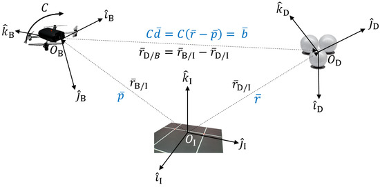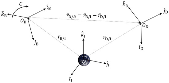 Illustrated in Figure 1, there are three frames: the Inertial reference (I) frame, the Body reference (B) frame, and the relative reference (D) frame. The Inertial frame remains fixed in space, while the Body frame is free to move throughout the system, relative to the I frame. The B frame is oriented by some rotation C (Direction Cosine Matrix) relative to the I frame. The respective position vectors from the Inertial frame (system origin) are given by and . goes to D from B, and can be given with respect to the body-centered frame , or the inertial-centered frame . This relation will be upheld across estimation methods; the upfront definitions are given because individual notation varies, but the fundamentals bind together the varying models with a unifying system. Ultimately, the final goal is to obtain a solution that yields the rotation C or q and the position of the body with respect to the Inertial frame . This general system relation will be interrelated across all forms of this problem.