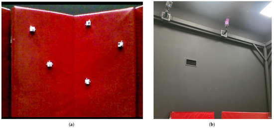 To validate correct estimates, the results were compared against true reference data. Vicon’s motion capture system defined the locations of the five beacons as well as the drone. The Vicon system consists of eight high-resolution cameras that capture moving objects at a rate of 120 Hz. Each beacon and drone were defined as rigid bodies (objects) in three dimensions using reflective markers. Figure 4 shows two of the eight Vicon cameras mounted across the lab and test setup, forming the Inertial frame. This provides a full overview of the hardware used for the experimental setup across the Body and Inertial frames.