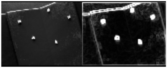 To test the method for orientation and position estimation in a physical setting, the drone operated on a static mount while detecting the beacons to obtain reference measurements. The first experiment used a stabilized, nominally oriented (no-tilt) drone to measure beacons, as shown in Figure 5 with the drone camera. A second experiment was performed where the drone was statically tilted at a roll angle of −15 degrees in the Body frame, as shown in the Figure 6, also with the onboard camera.