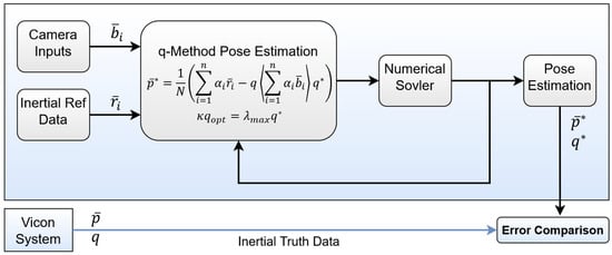 In aerospace engineering and robotics, the estimation of attitude and position is an essential factor for precise autonomous operations [1,2,3,4,5]. Attitude estimation enables one to determine the vehicle’s orientation in a three-dimensional space, while position estimation determines the vehicle’s translational coordinates in a three-dimensional space. Modern methods integrate optimal filtering techniques by fusing measurements from local or global sensors with knowledge of the vehicle’s motion dynamics. Traditional methods often involve sensor fusion techniques combining visual, inertial, and GPS data. Visual odometry and simultaneous localization and mapping (SLAM) have been widely adopted for pose estimation using cameras and other imaging sensors, while inertial measurement units (IMUs) are often used to provide complementary motion information [6]. Techniques such as the Kalman filter, Extended Kalman Filter (EKF), and Unscented Kalman Filter (UKF) have been extensively applied. For instance, Zhang et al. [7] demonstrated the effectiveness of EKF in fusing data from inertial measurement units (IMUs) and global navigation satellite systems (GNSSs) to improve the robustness of UAV positioning in urban environments. Similarly, Liu et al. [8] explored the use of particle filters for attitude estimation in multi-sensor setups, highlighting their resilience to sensor noise and dynamic changes. One significant challenge in these methods is to deal with sensor noise and environmental conditions [9] that affect sensor performance, such as poor lighting or featureless scenes. Several researchers have focused on enhancing these techniques through the integration of LiDAR and deep learning-based approaches [10] to improve robustness and real-time performance, particularly in GPS-denied environments. Another challenge is associated with handling the coupled dynamics with the estimated position and attitude simultaneously [11]. Therefore, this research develops a generalized formulation that combines the estimation of position and attitude based on the well-known q-method framework [12].