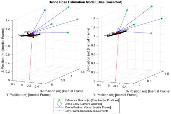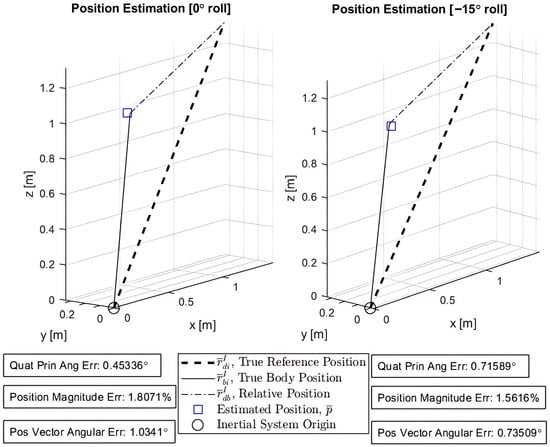 The generalized q-method pose estimation formulation was able to successfully estimate both the position and orientation of the drone for both attitude configurations. Both and are the optimal values for the pose that minimizes the error of the system given the drone camera measurements with sensor noise. Figure 9 is designed to mirror the system definition (Figure 2). It overlays the estimated position onto the true body position vector . Here, all inertial and truth data obtained from the Vicon system are used to validate the results of the pose estimation. The inertial system origin is the center floor of the laboratory in which the experiment is performed. True reference position vectors are essential prior-knowledge of the Inertial frame or system, or wherever the drone intends to operate—also obtained by Vicon.