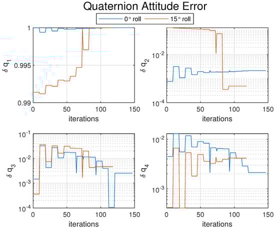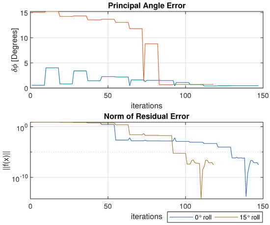 The remaining figures detail the results of interest across each iteration of the numerical solver until convergence is reached. Iterative results for both the 0° roll and ° roll cases are overlaid within Figure 10, Figure 11 and Figure 12 for ease of presentation. Figure 10 displays the principal angle error for an understanding of the aggregate attitude error. The bottom plot of the same figure shows the norm of the residual error as the function fsolve converges to a stopping condition.