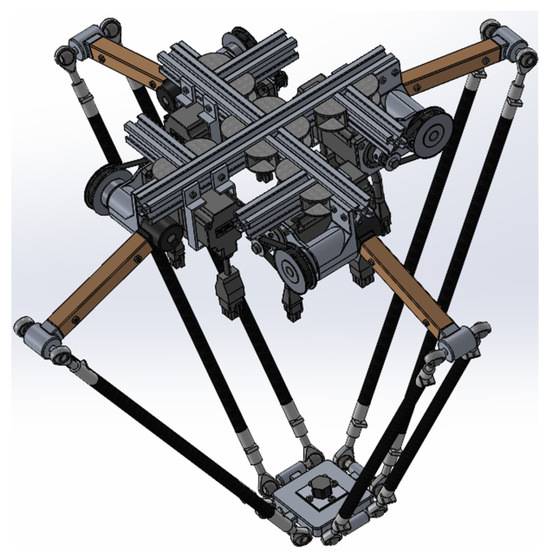 The design of the manipulator, the result of which can be seen in Figure 1, was carried out in SolidWorks 2024 SP1.0 based on the kinematic and dynamic analysis developed by the authors in previous works. The robot has four arms arranged at 90° of each one and has 3 DoF. The structure of the bases and arms are made of 3003 aluminum, while the forearms are made of carbon fiber. For detailed specifications, modeling, and construction details, refer to [28,29].