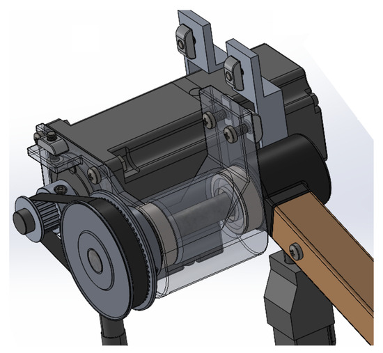 Figure 2 shows the SolidWorks design of the servomotor coupled to one of the Delta robot’s arms through a pulley and belt transmission mechanism. This system allows the motor’s motion to be efficiently transmitted to the robot’s arm, ensuring precision and control in the mechanism’s operation.