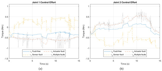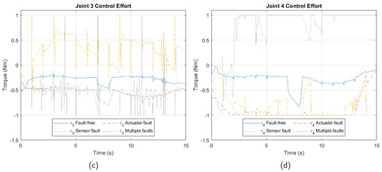Control effort due to faults. (a) Joint 1. (b) Joint 2. (c) Joint 3. (d) Joint 4.