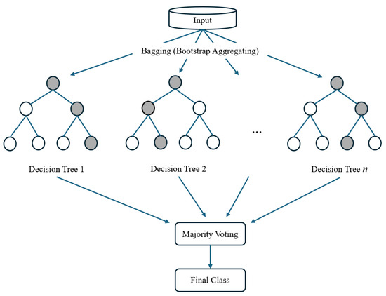 Bagged Trees generate multiple subsets of the training data using random sampling with replacement. Each subset is used to train a decision tree independently on its respective subset. These trees are typically not pruned, meaning they capture intricate patterns in the data. For classification tasks, bagged trees use majority voting to combine the results of individual trees. The final prediction is the class most frequently predicted by the ensemble [30,31]. Figure 5 shows the general structure of the bagged trees.