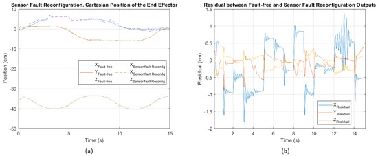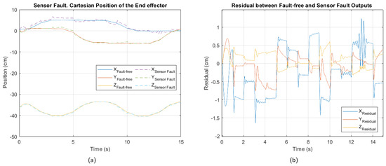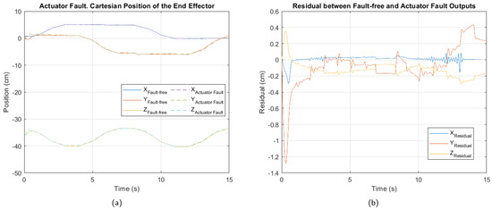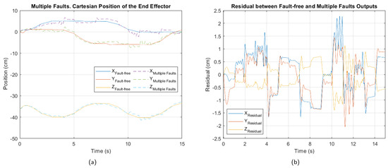 Independent simulations of three faults on the manipulator were performed, each lasting 15 s. The first fault corresponds to a breakdown in actuator 3, causing a loss of control over that joint. The second fault is located in the position sensor of motor 2, resulting in incorrect feedback of the joint movement. Finally, the third fault is of multiple types, simultaneously combining the two previous faults.